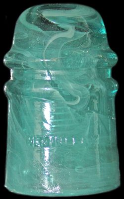 Lot 59: CD 121 HEMINGRAY // PATENT Color: Jadey Milky Blue Aqua Description: Smooth base! 1 1/2" base flake in the rear, an annealing stress line in the front. Some would call this Jade but we'll be conservative and call it Milky Aqua because of the great swirling; you can decide! A stunning piece; one can see a great depth of color variation, especially in the dome. See lot 61 for another great milky Hemingray! This is also a very unusual piece, one of the very few Hemingray pieces that are embossed with the May 2, 1893 drip point patent date, but have a smooth base! Great color and a unique embossing makes this very desirable! Estimate: $250 - $300 Open: $10 Price Realized: $374 |