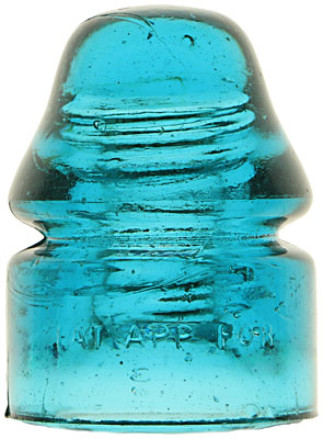 Lot 53: CD 133.1 PAT APP FOR [020] Color: Rich Brooke's Blue Description: What a bright and well-saturated color for this piece! CD 133.1 "PAT APP FOR" insulators were produced using Homer Brooke's press to form threads. Outstanding condition for this stunning jewel! Estimate: $200 - $250 Open: $1 Price Realized: $297 |